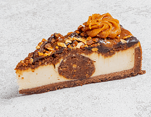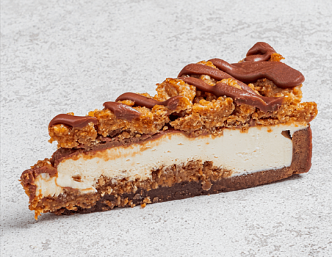 Классический сливочно-сырный чизкейк Нью-Йорк на подложке из песочного шоколадного теста с начинкой из шоколадного ганаша и карамельного кранча. Сверху чизкейк украшен ка...