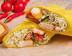 Курица гриль, тигровые креветки, свежая капуста, пикантная морковь, свежие огурцы, сочный помидор, г...
