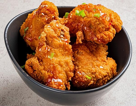 Крылышки в кляре, сладкий чили соус, кунжут кимчи, зелёный лук.
